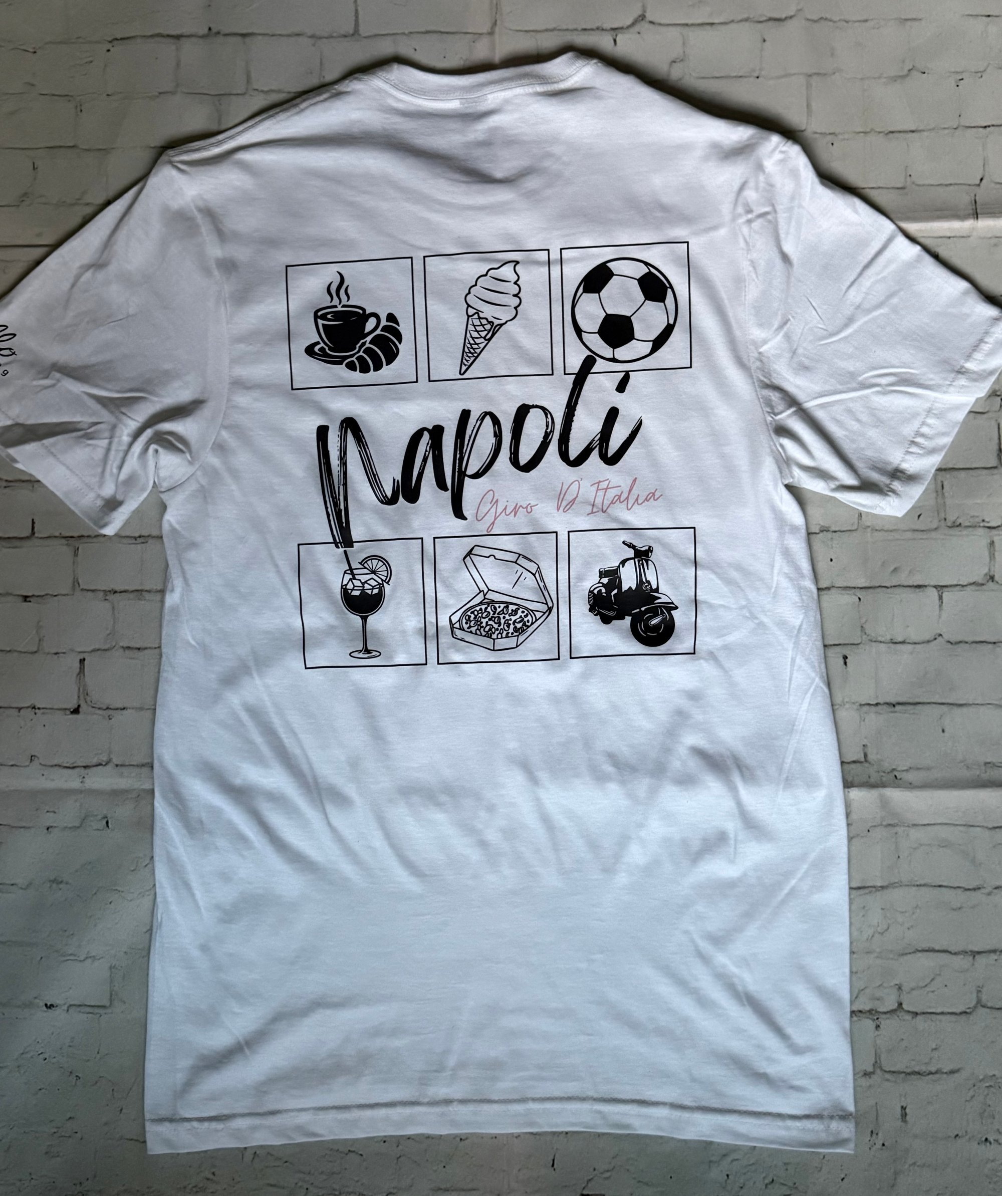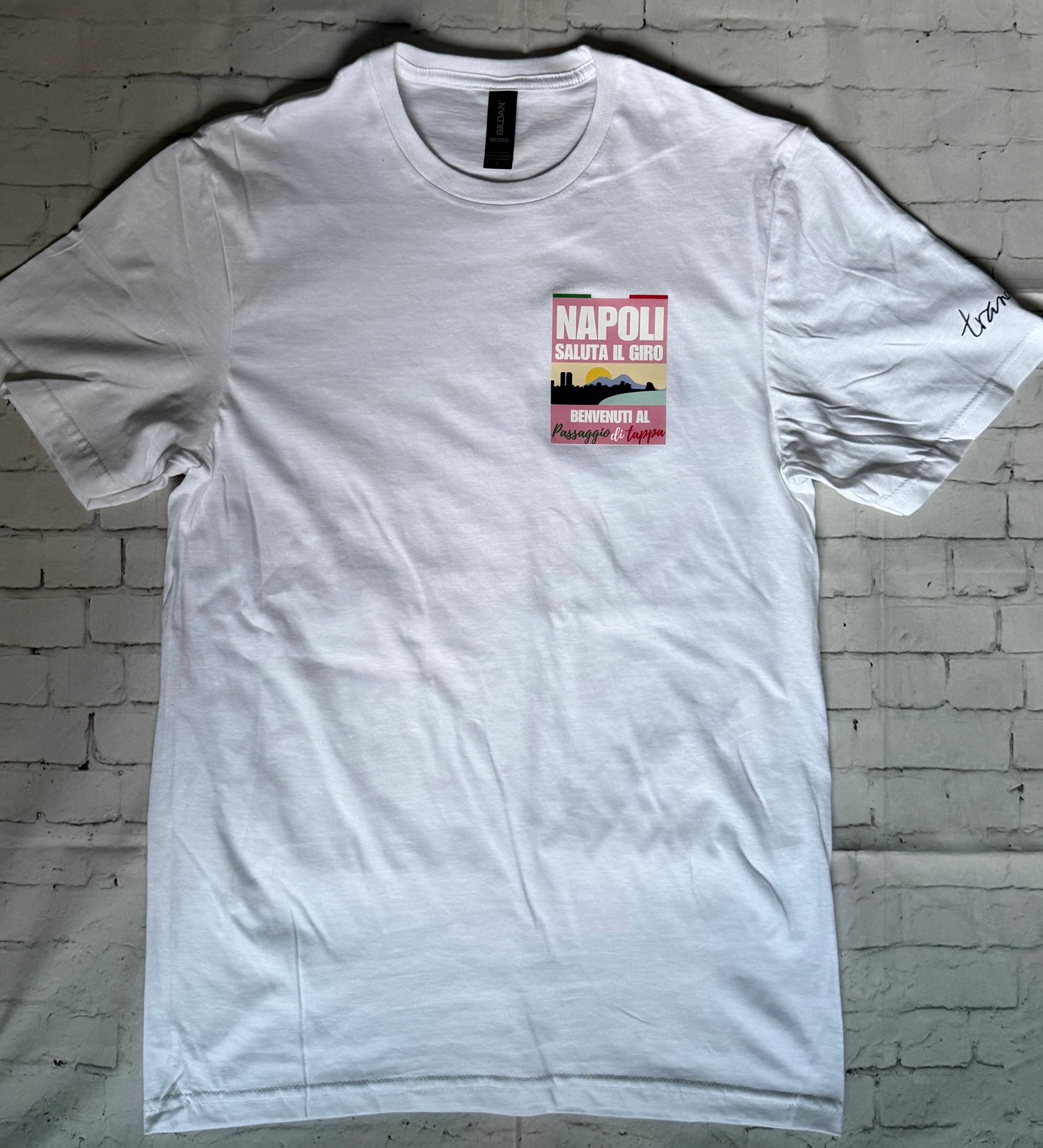 Our Napoli tee... Napoli has a deep and historic connection with the Giro D'Italia dating back to the inaugural 1909 race. The capital of the Campania region in southern Italy featured in that first Giro, has hosted the Grande Partenza twice (1963, 2013) and has hosted a stage finish 46 times. In recent years it's been a staple feature in the Giro route with stage finishes in 2022, 2023, 2024, 2025 and again this year 2026. Tranquillo were lucky enough to be there watching roadside in both 2022 (Thomas De Gendt won from a breakaway) and 2024 Olav Kooij winning from a bunch sprint), both times spectating on the beautiful Monte Di Procida to the west of the city. Looking further back Cav won there in 2013 and was presented his maglia rosa by his great friend and cycling enthusiast Sir Paul Smith (who had designed the leaders' jerseys that year), Italian favourite Francesco Moser won a time trial there wearing the maglia rosa in 1974, and the great Eddy Merckx celebrated his first Giro title there in 1968 when Napoli hosted the final stage. Our tee celebrates Napoli as a Giro host and as a breathtaking city in it's own right, a juxtaposition of ancient streets swarming with modern life. Our tee is DTF printed on 100% cotton.